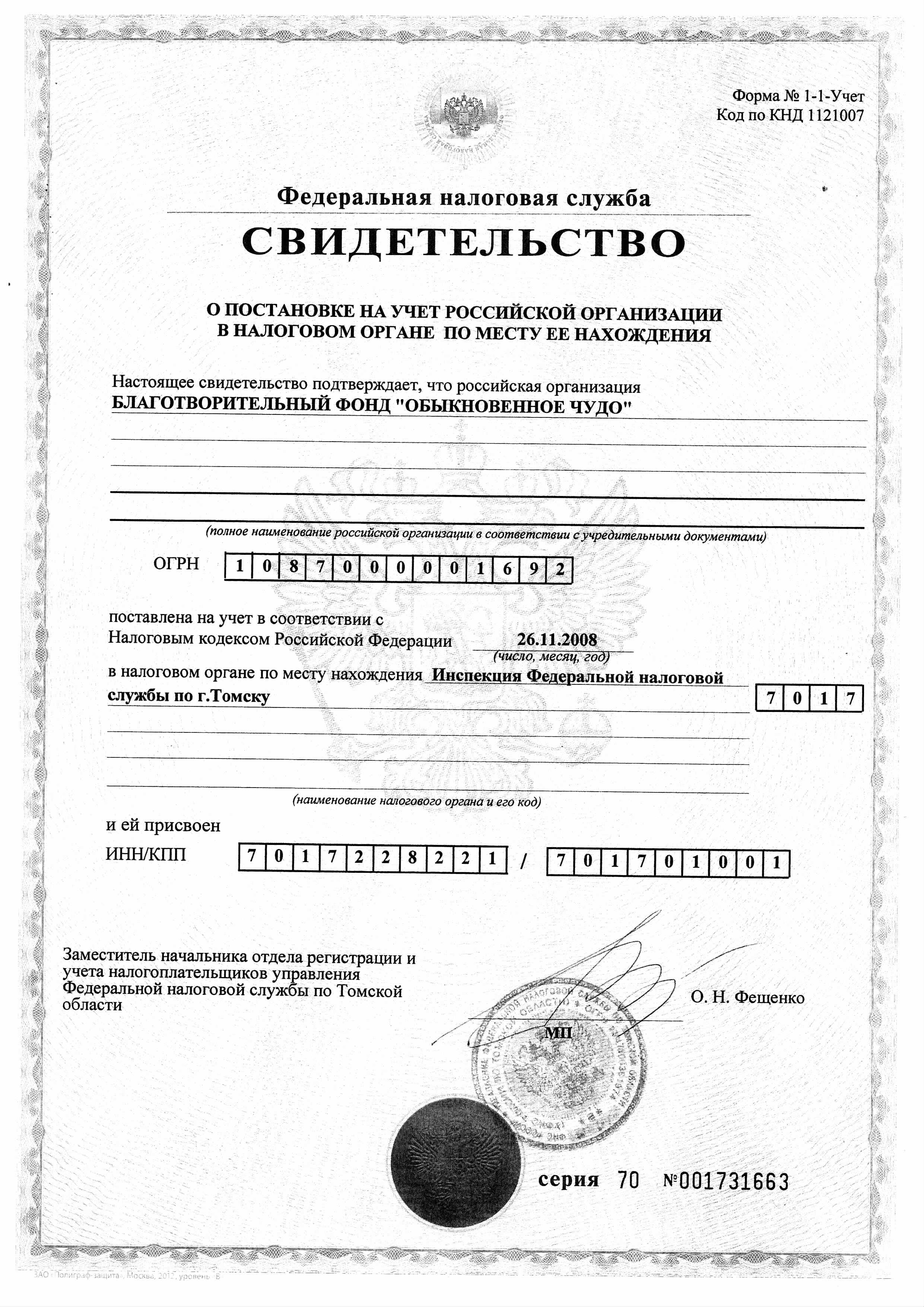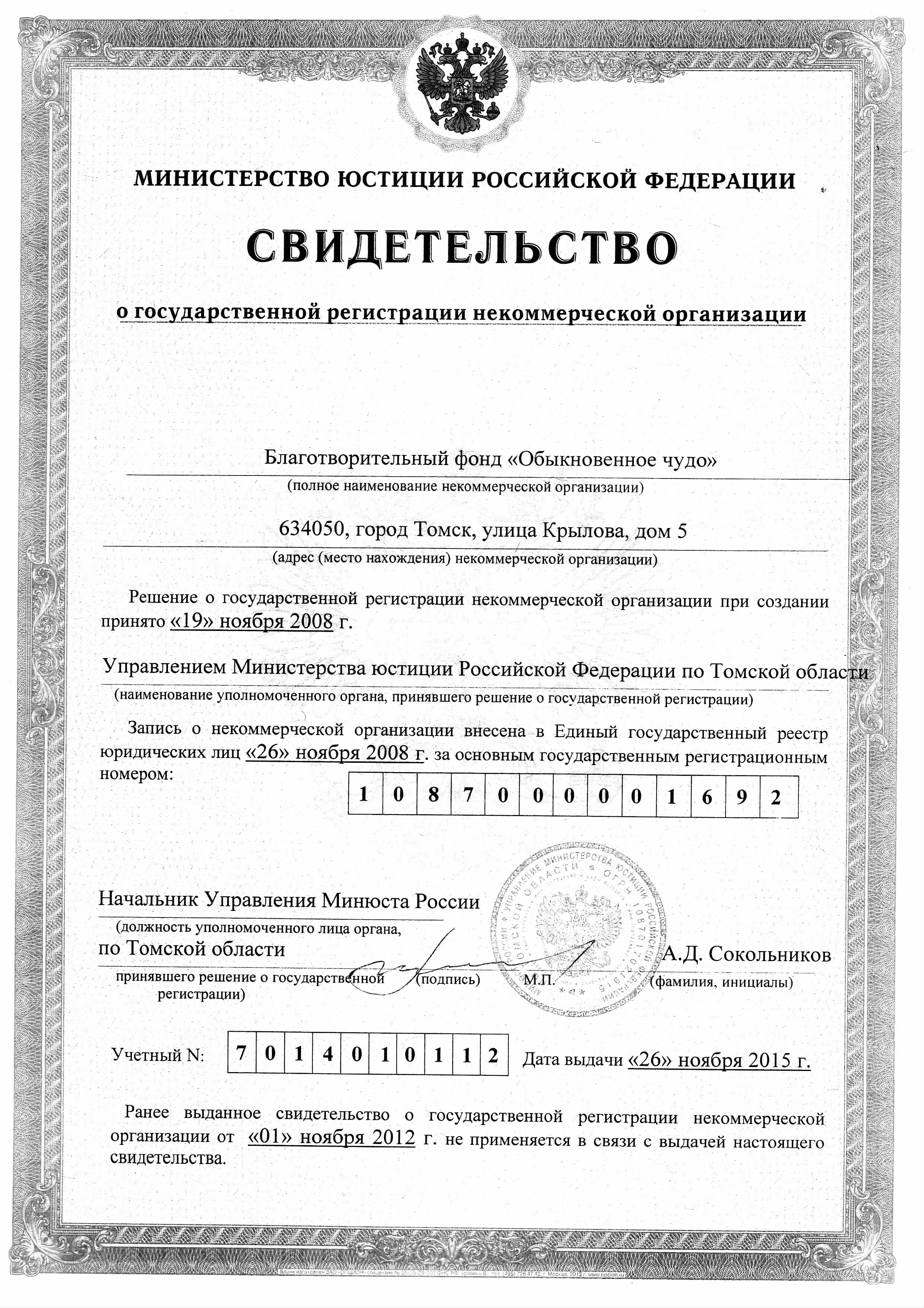 Незадолго до регистрации Устава фонда «Обыкновенное чудо» Управление Федеральной налоговой службы Российской Федерации по Томской области внесло наш фонд в Единый государственный реестр юридических лиц. Дата регистрации фонда - 26 ноября 2008 года - и считается нашим Днем рождения. И мы ежегодно ждем вас на наших праздничных мероприятиях. А пока что вы можете увидеть свидетельства о государственной регистрации некоммерческой организации (ОГРН) и о постановке на учет в налоговом органе (ИНН).